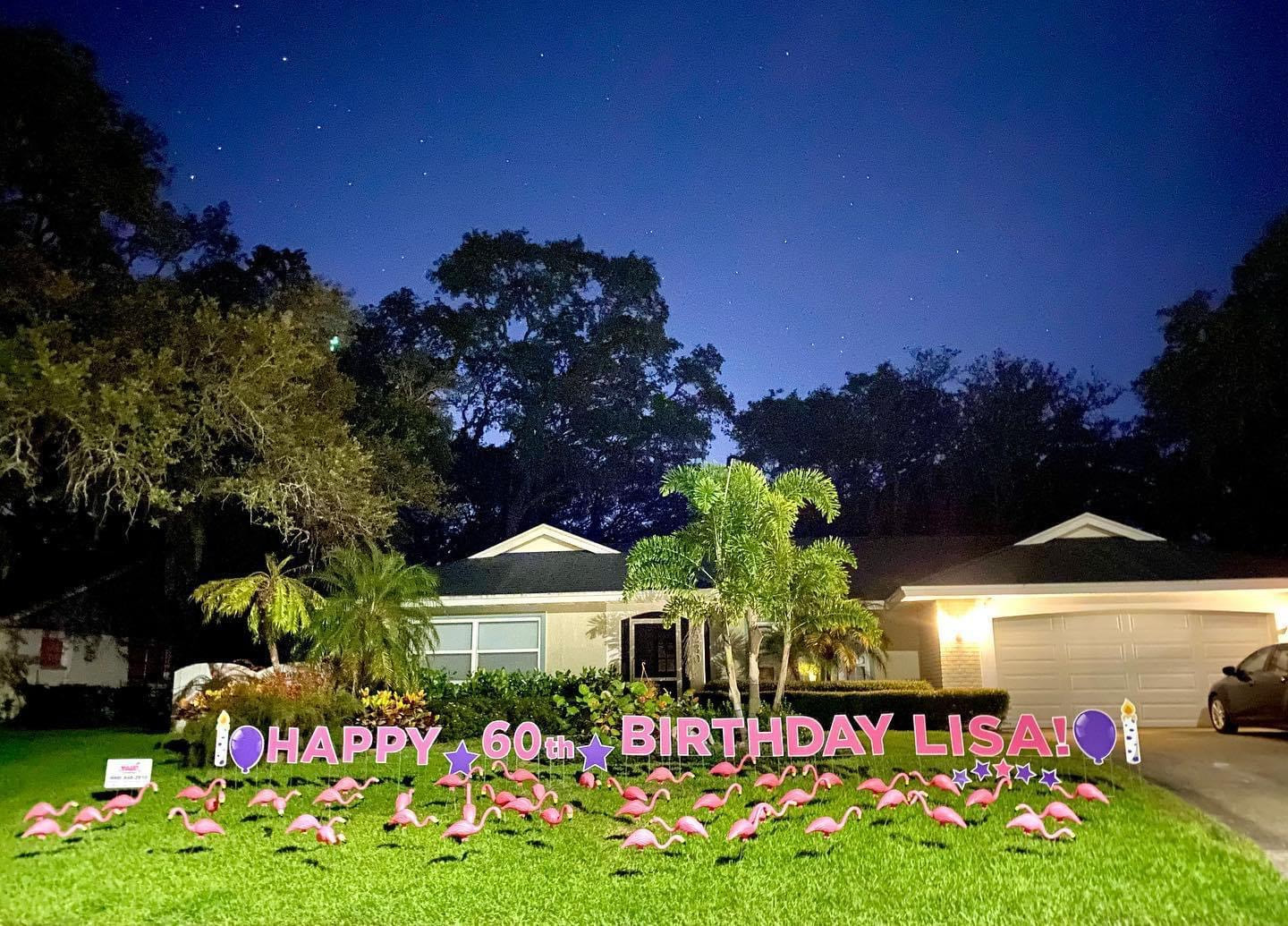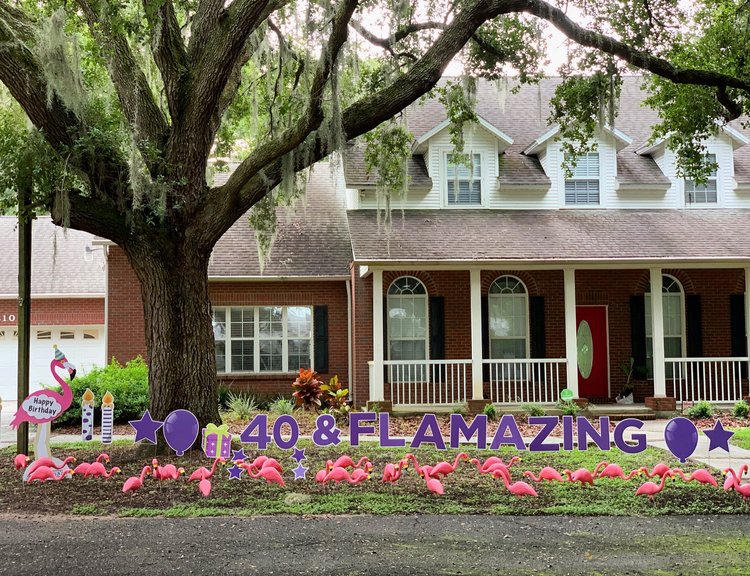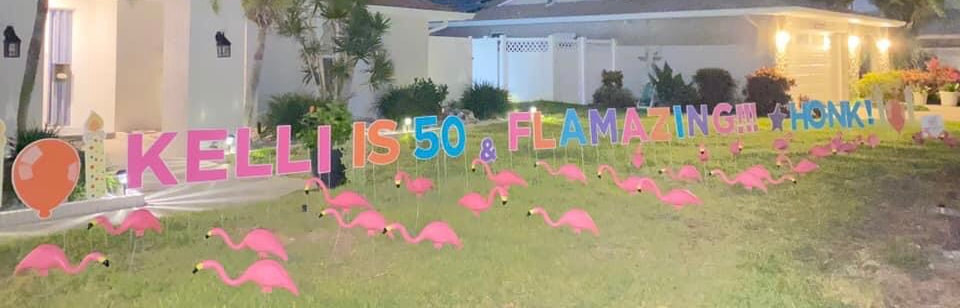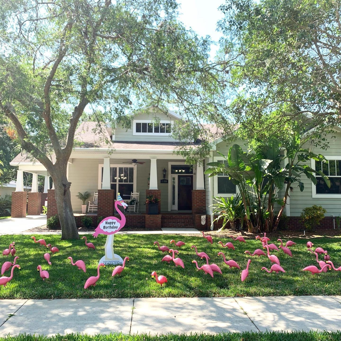 Includes our Extra Large Flamingo with your choice of available Greetings & a yard full of Baby Flamingos! Our Weekday rental includes one day of Flamingo Flocking. Additional days and upgrades can be added for an additional fee.